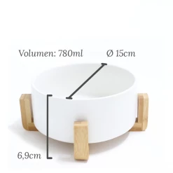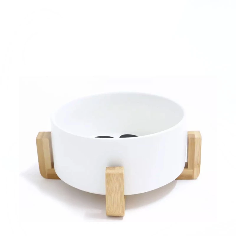 La ciotola rotonda in ceramica di alta qualità si trova sull’elegante cornice in legno di bambù.