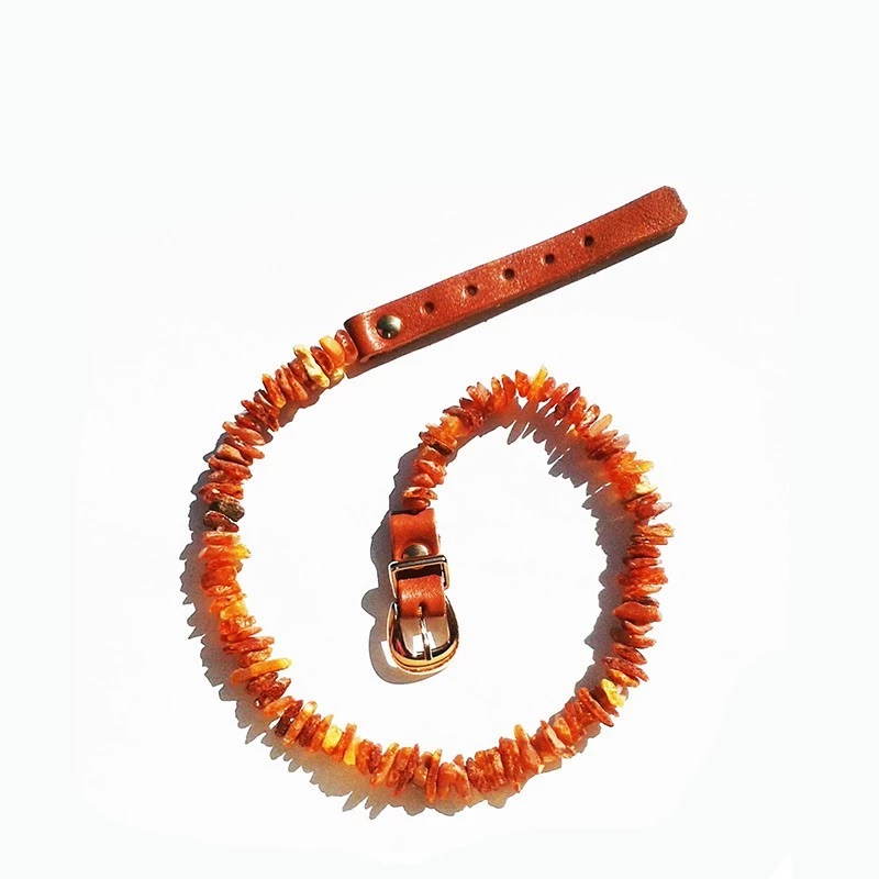I collari sono realizzati in ambra naturale GREZZA e sono dotati di comodo CINTURINO REGOLABILE IN CUOIO..