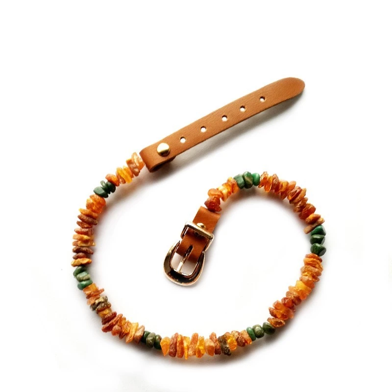 I collari sono realizzati in ambra naturale GREZZA e sono dotati di comodo CINTURINO REGOLABILE IN CUOIO..