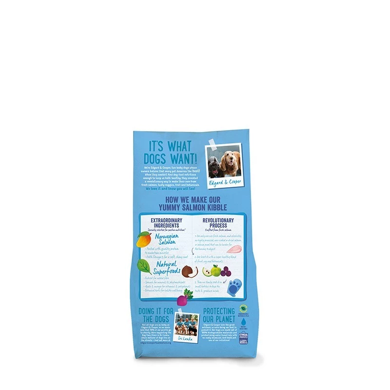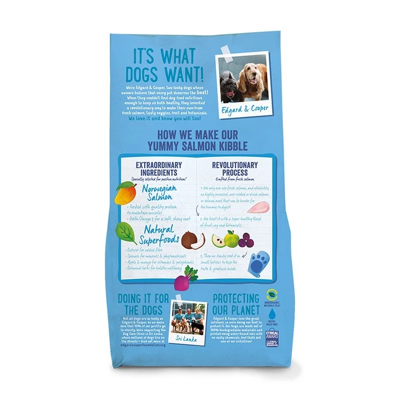 Salmone fresco 40%, Patate, Piselli, Proteina di piselli, Semi di lino, Olio di pesce, Sughetto di verdure, Minerali, Mannanoligosaccaridi (MOS), Fruttoligosaccaridi (FOS),Barbabietola (0,04%), Mele (0,04%), Mango (0,04%), Avocado (0,04%), Cocco (0,04%), Spinaci (0,04%), Ribes neri (0,04%), Fiori di calendula, ortica, Foglie di rovo, Finocchio, Cumino dei prati, Camomilla, Melissa.