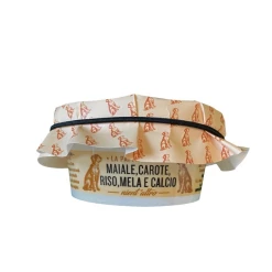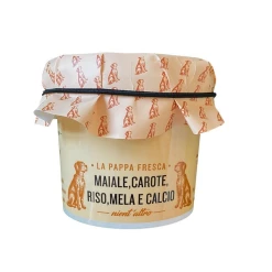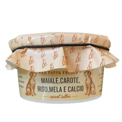 COMPOSIZIONE : Carne di Maiale 34%, Cuore di Maiale 33%, Mela 14%, Carota 14%, Riso 4,97%, Carbonato di calcio 0,03% (di cui calcio 0,012%).