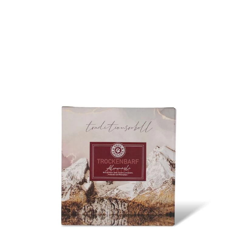 Il MUESLI ALPINO di Paul & Paulina è composto per il 75% da carne delicatamente essiccata all’aria e per il 25% da miglio, frutta, verdura ed erbe aromatiche.Â