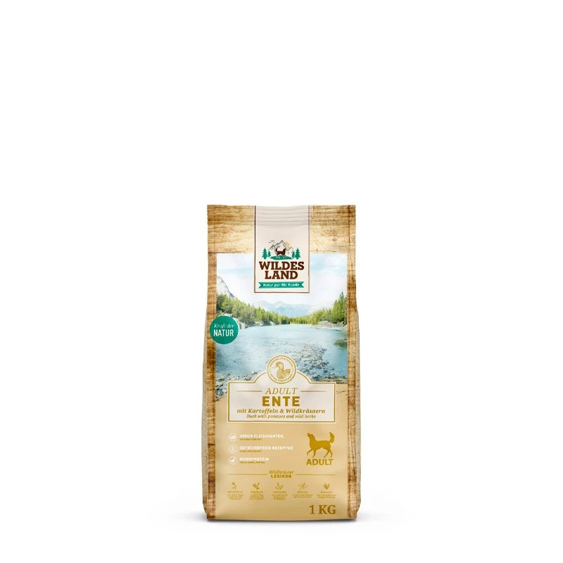 Carne di anatra fresca 20%, carne di anatra essiccata 20%, piselli 20%, patate 16%, grasso di pollo, fagioli 5%, semi di lino 3%, lievito di birra, polpa di barbabietola, alghe 0,3%, cicoria mark, frutto-oligosaccaridi (FOS 0.2 %), Estratto di lievito (MOS 0,2%), estratto di yucca 0,03%, cardo mariano 0,02%, dente di leone 0,02%, rosmarino 0,02%, ibisco 0,02%, rosa canina 0,002%.